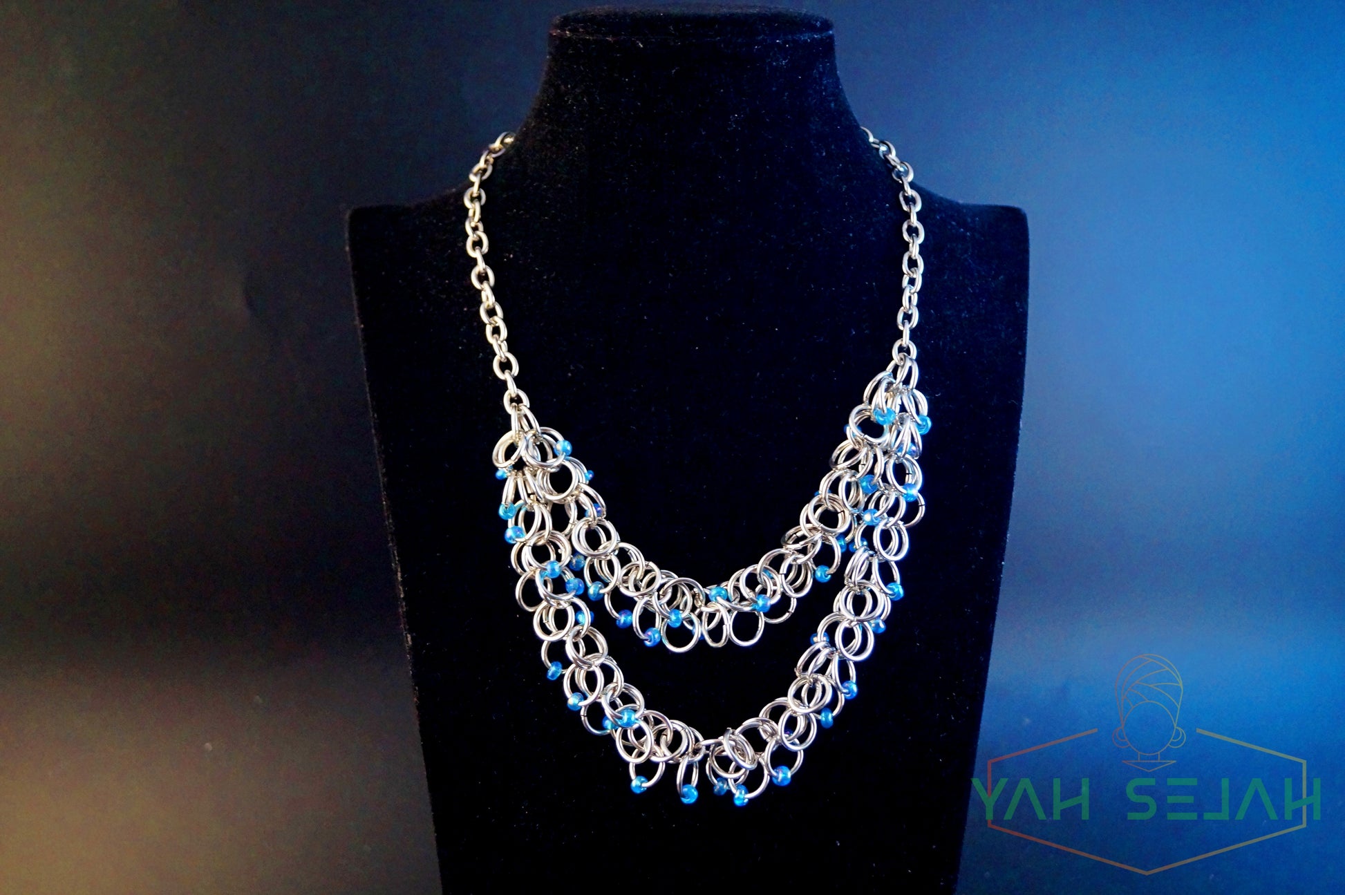 Kette besteht aus Stahl und bei den Blauen Perlen handelt es sich um Glasperlen
