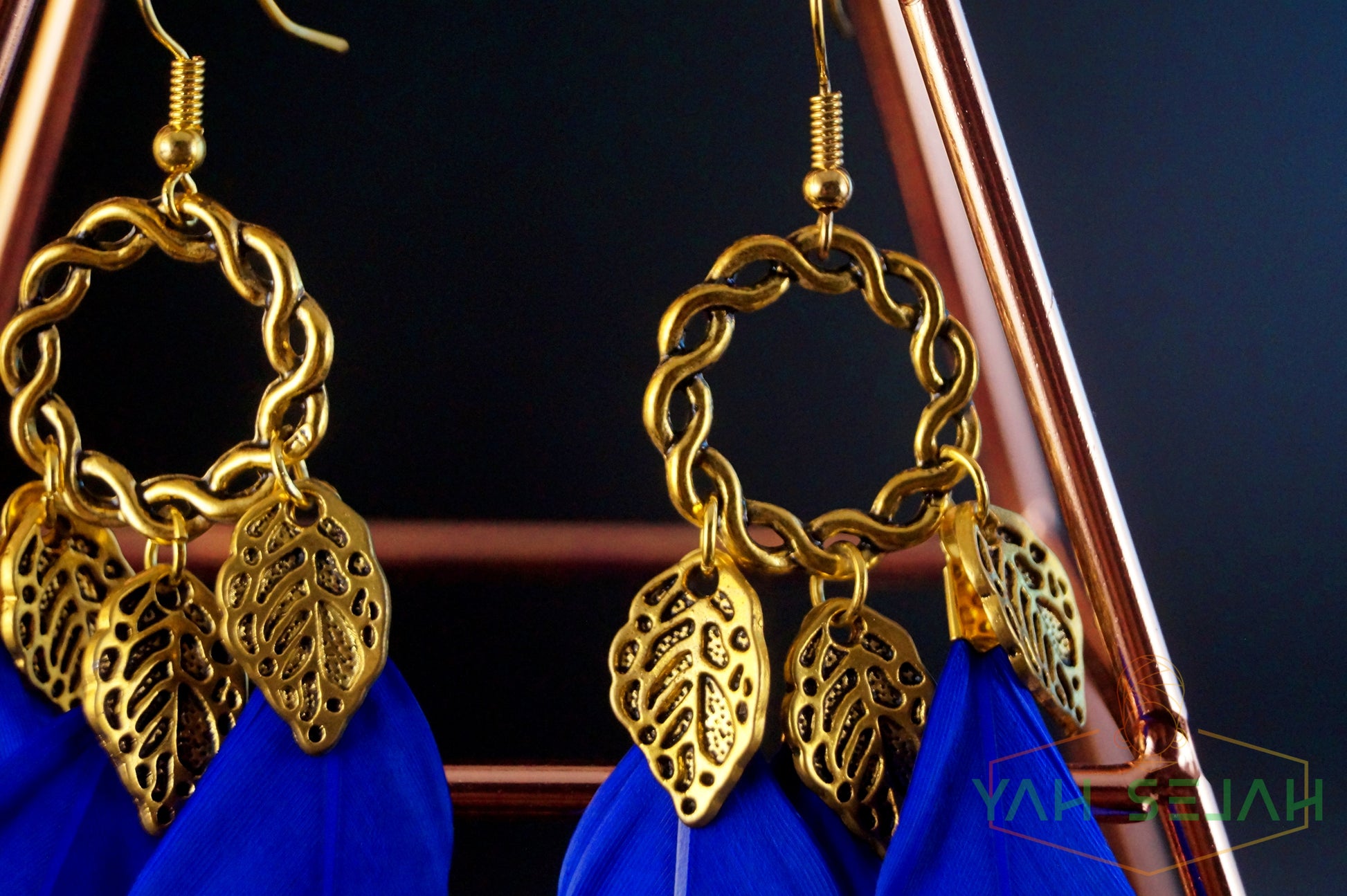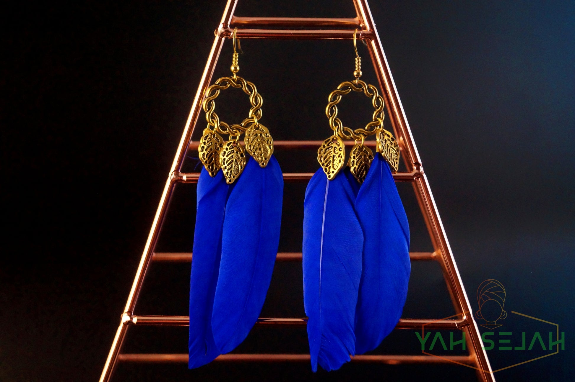 Die Dunkelblaue und Messinggelbe Farbe lassen sie Edel aber dennoch Gewagt erscheinen,doch die Federn geben dem Ohrring eine Sanften touch!