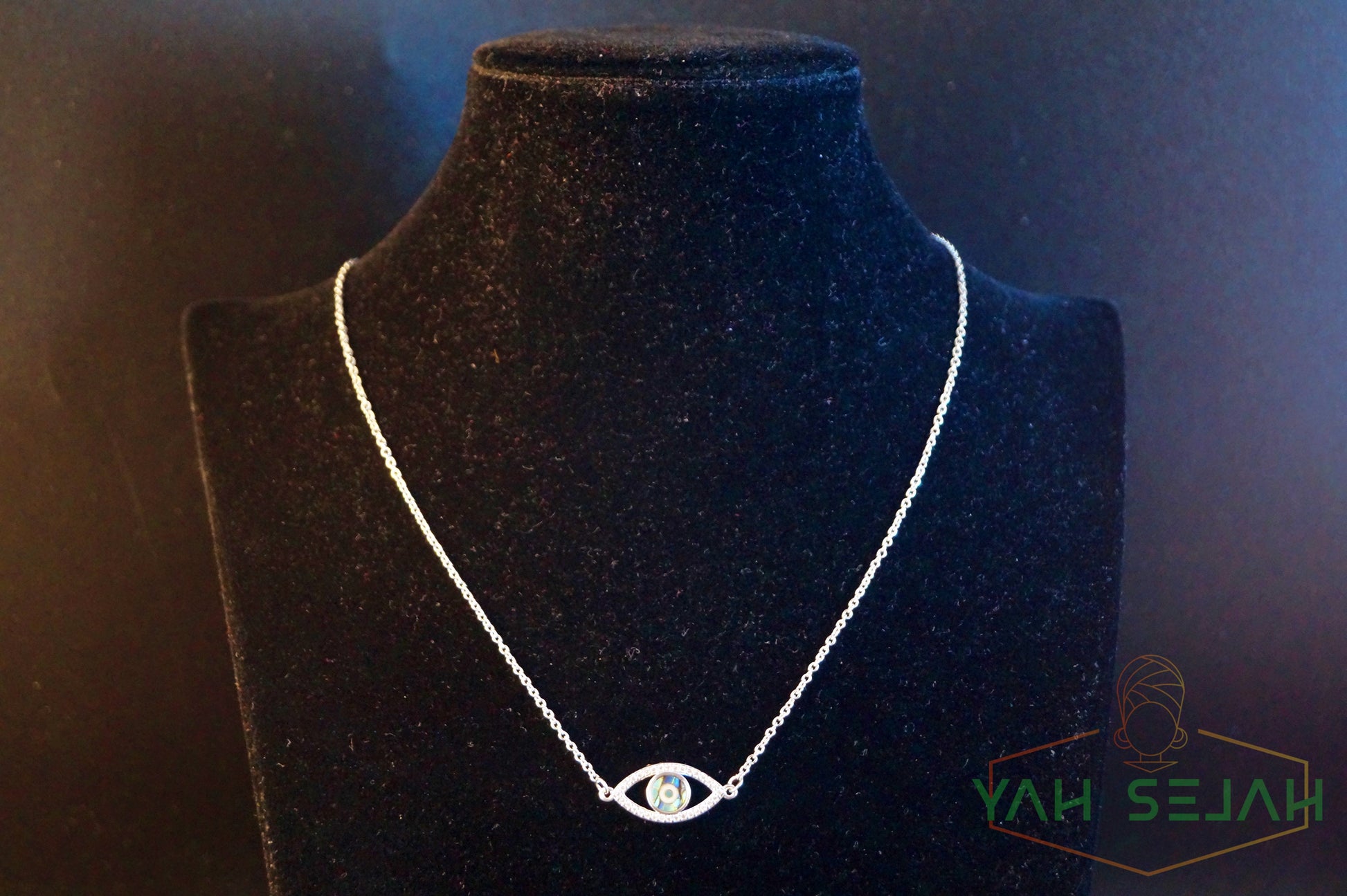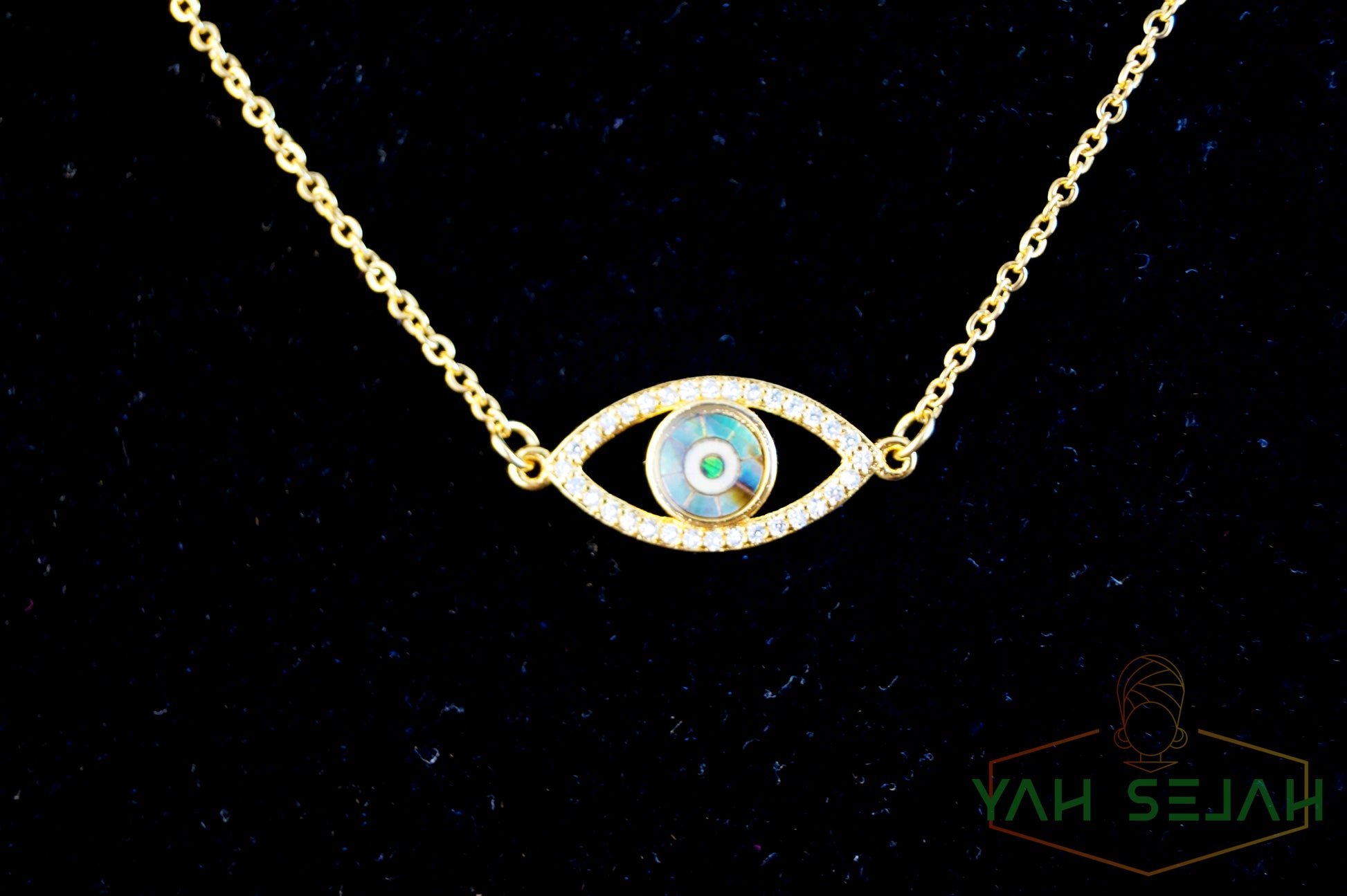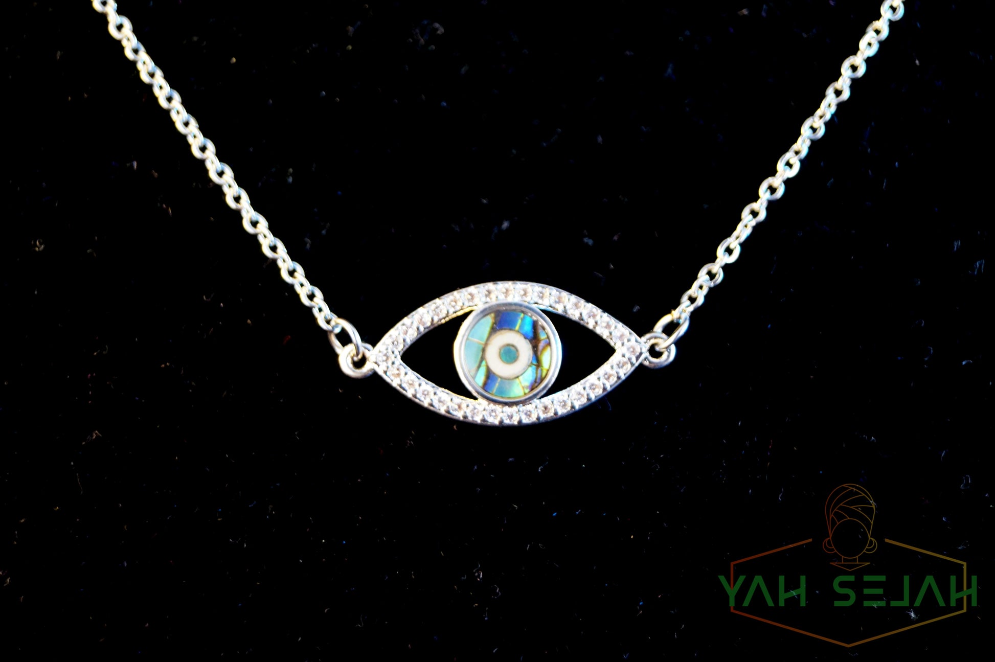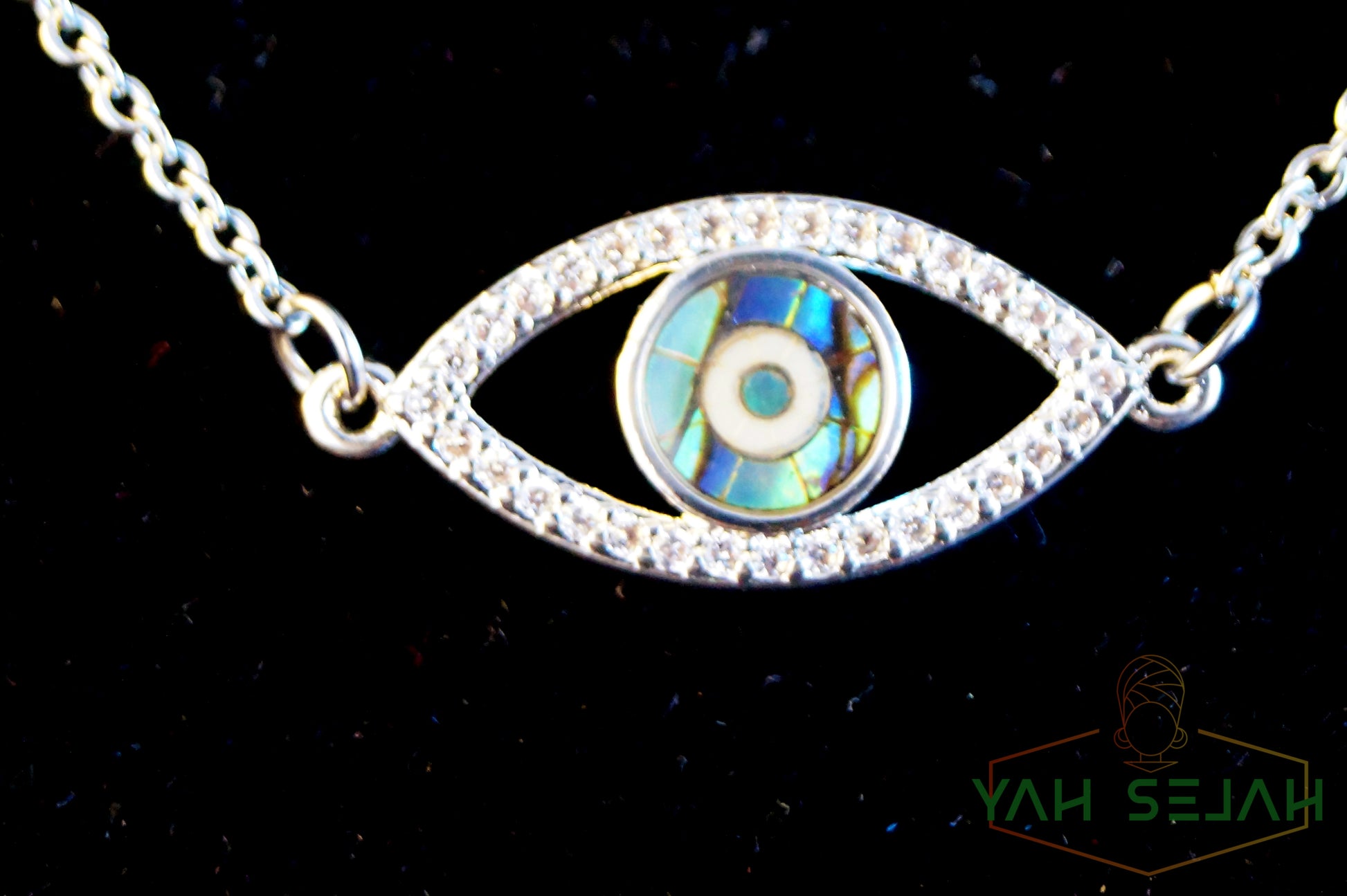 Der Anhänger wurde in der Form eines Auges gefertigt und mit Zirkonen Weißen Muscheln und Paua Muscheln Verziert.