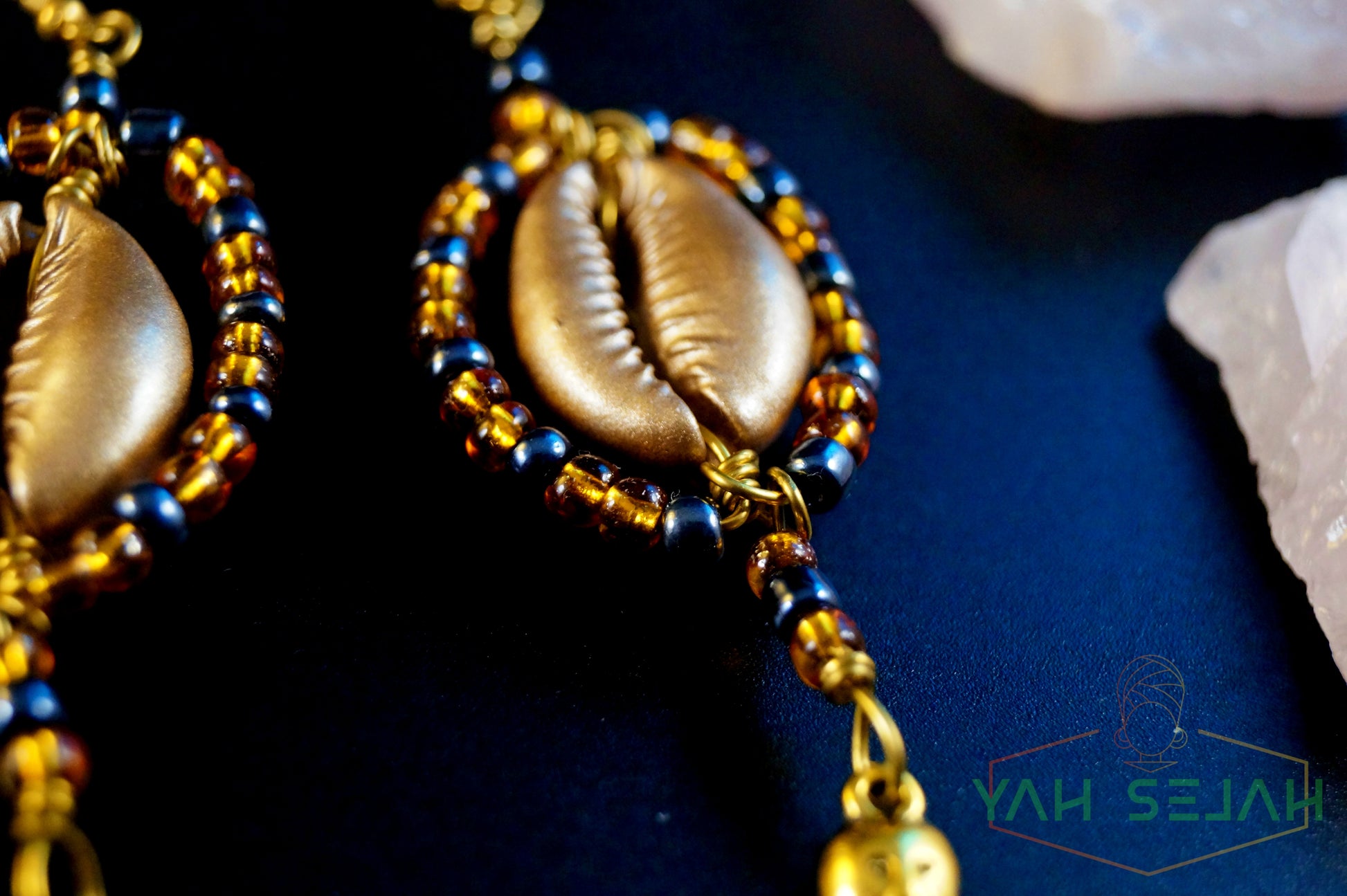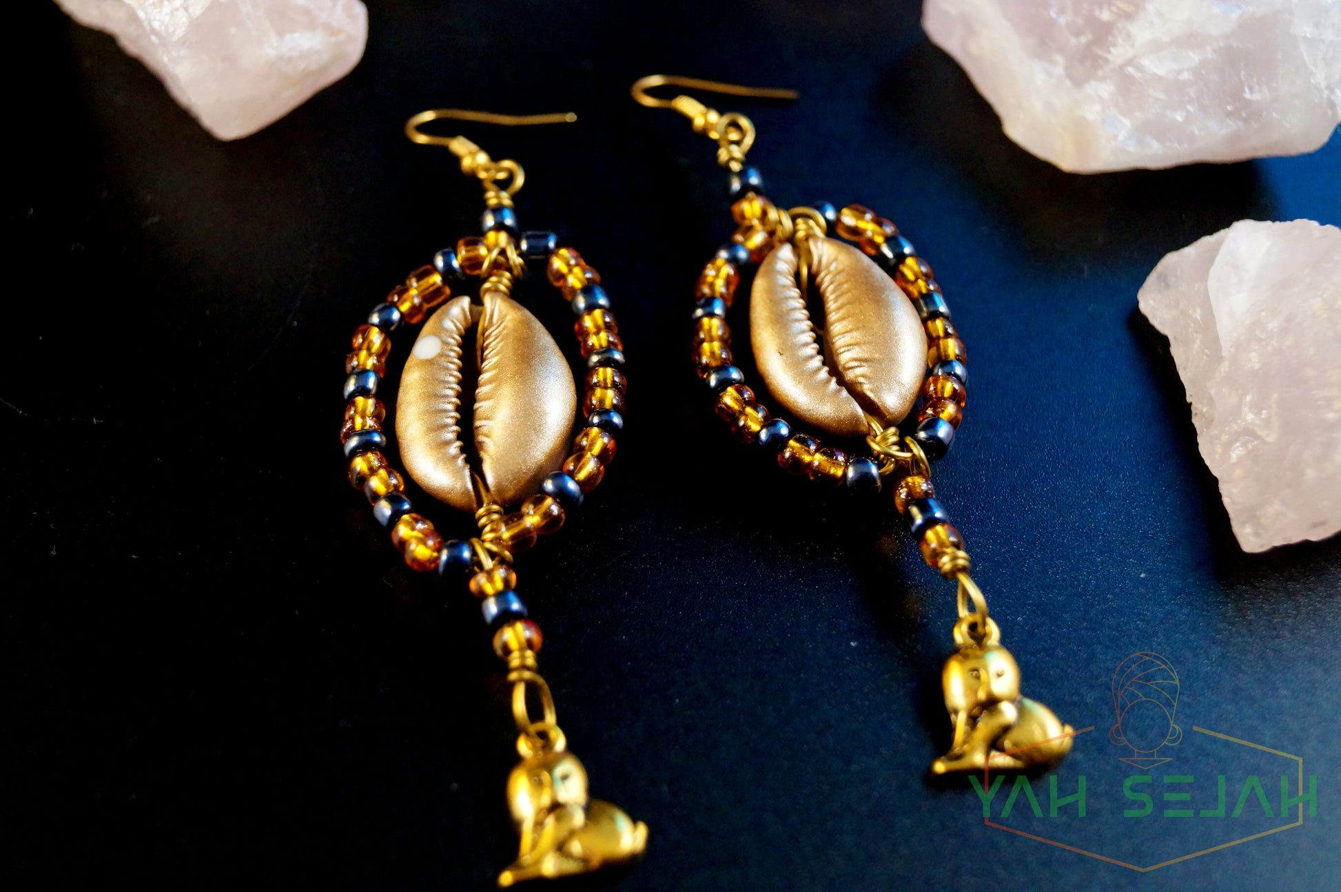 Die Goldene Farbe der Galvanisierten Kauri Muscheln,des Löwen Anhängers,der Goldgelben Glasperlen und der 18k vergoldeten Ohr haken in Kombination mit der Anthrazitfarbenen Glasperlen geben einen Wünderschönen,leicht Rebellischen dennoch Harmonisches zusammen Spiel.