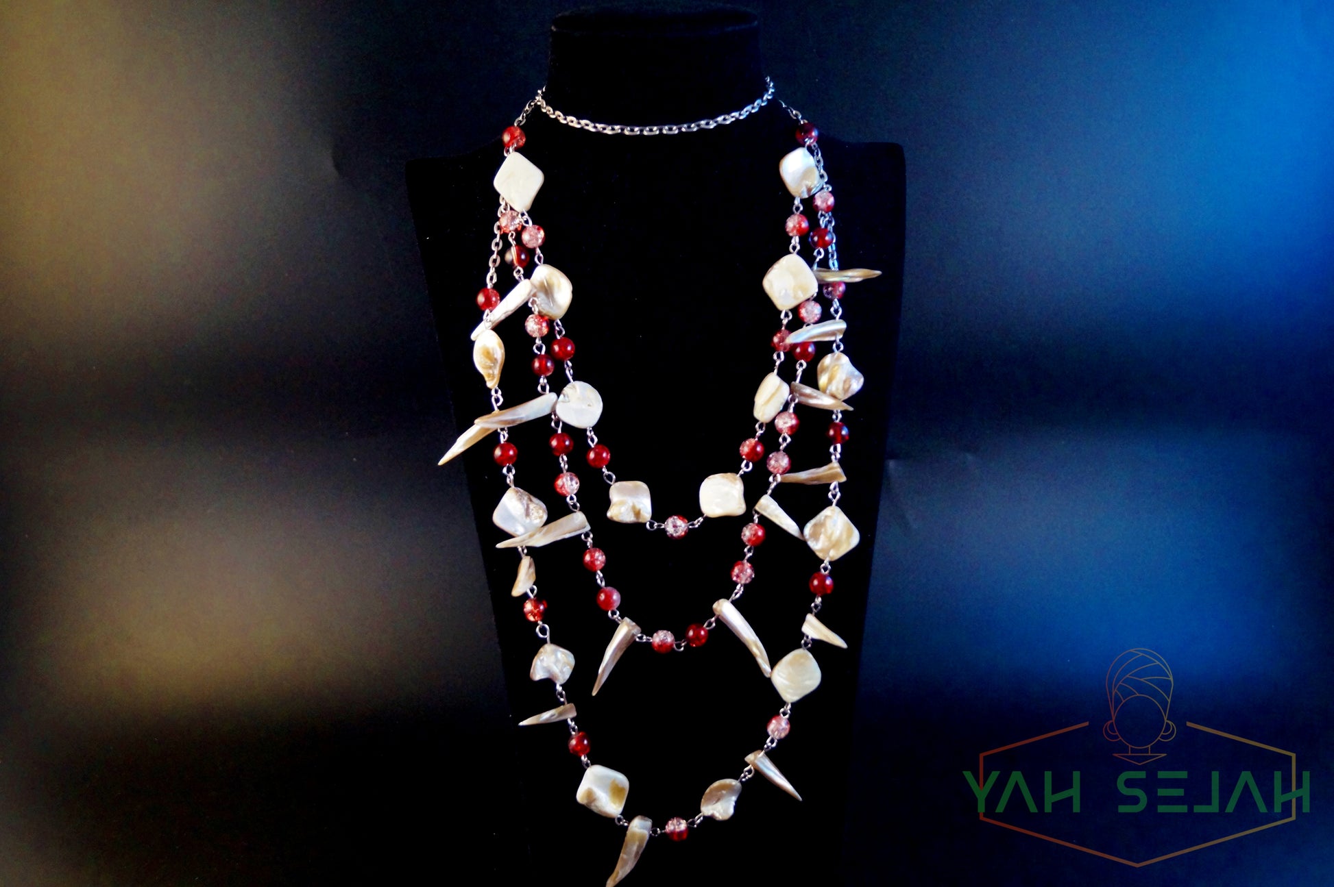 Die kette ist aus Echten Perlmutt Perlen in verschieden Größen gemacht und mit Rot Weißen Glasperlen im Cracked Look.