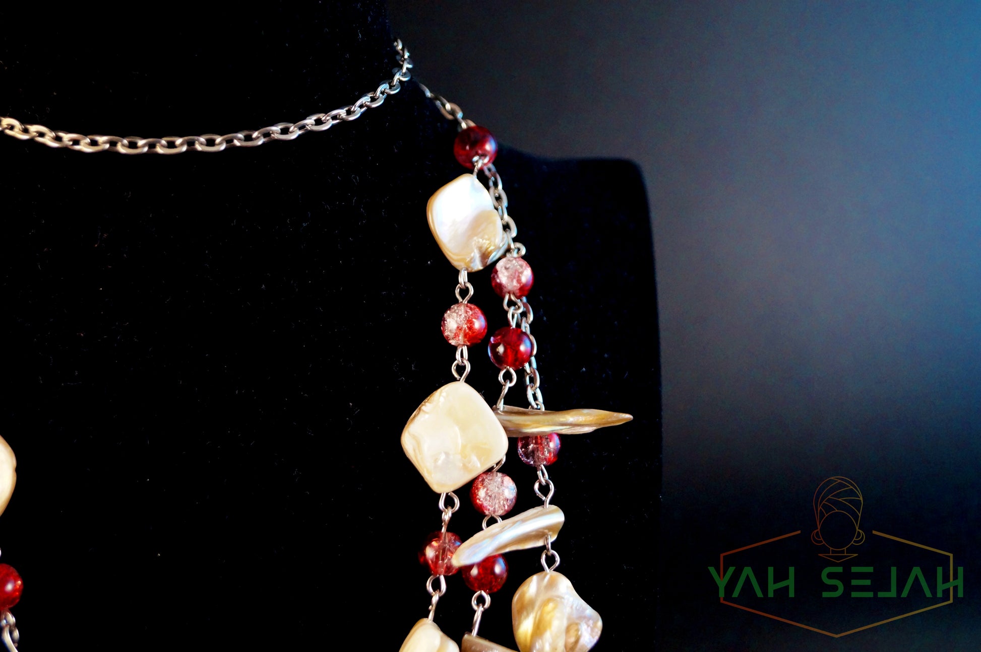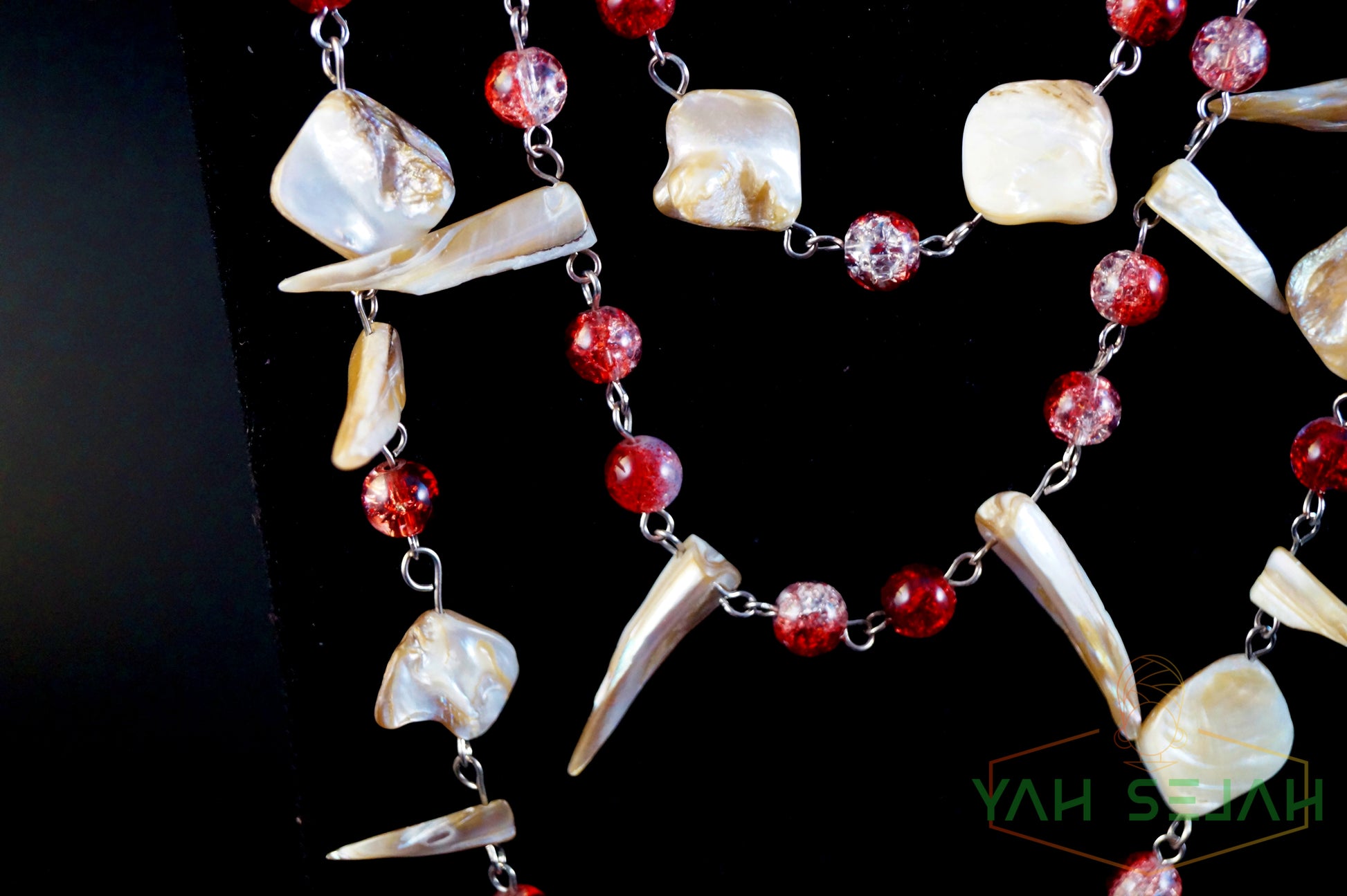 Einzigartiges Design mit Echten Perlmutt,und als Eyecatch Akzent Rot Weiße Glasperlen im Cracked Look.