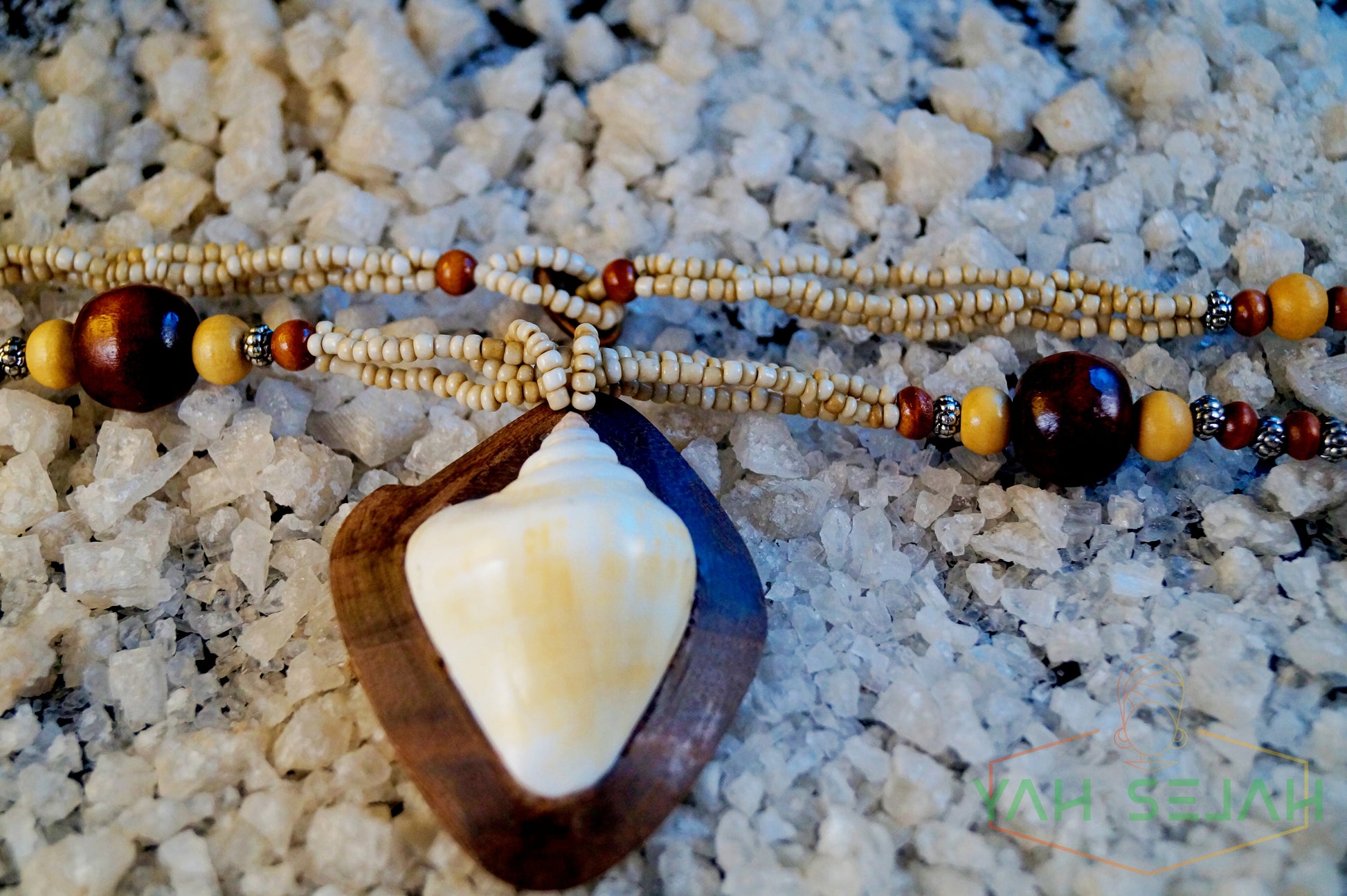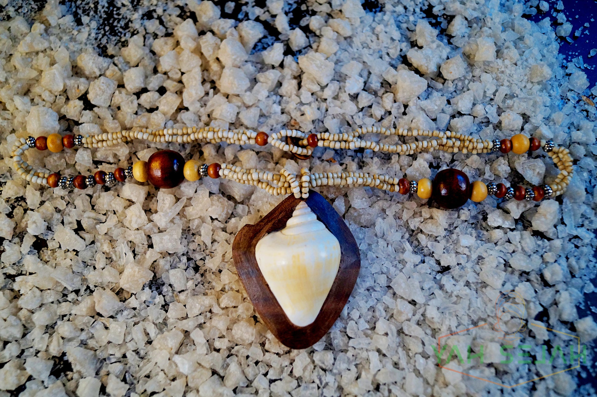 Der Anhänger ist aus Holz und einer Muschel.