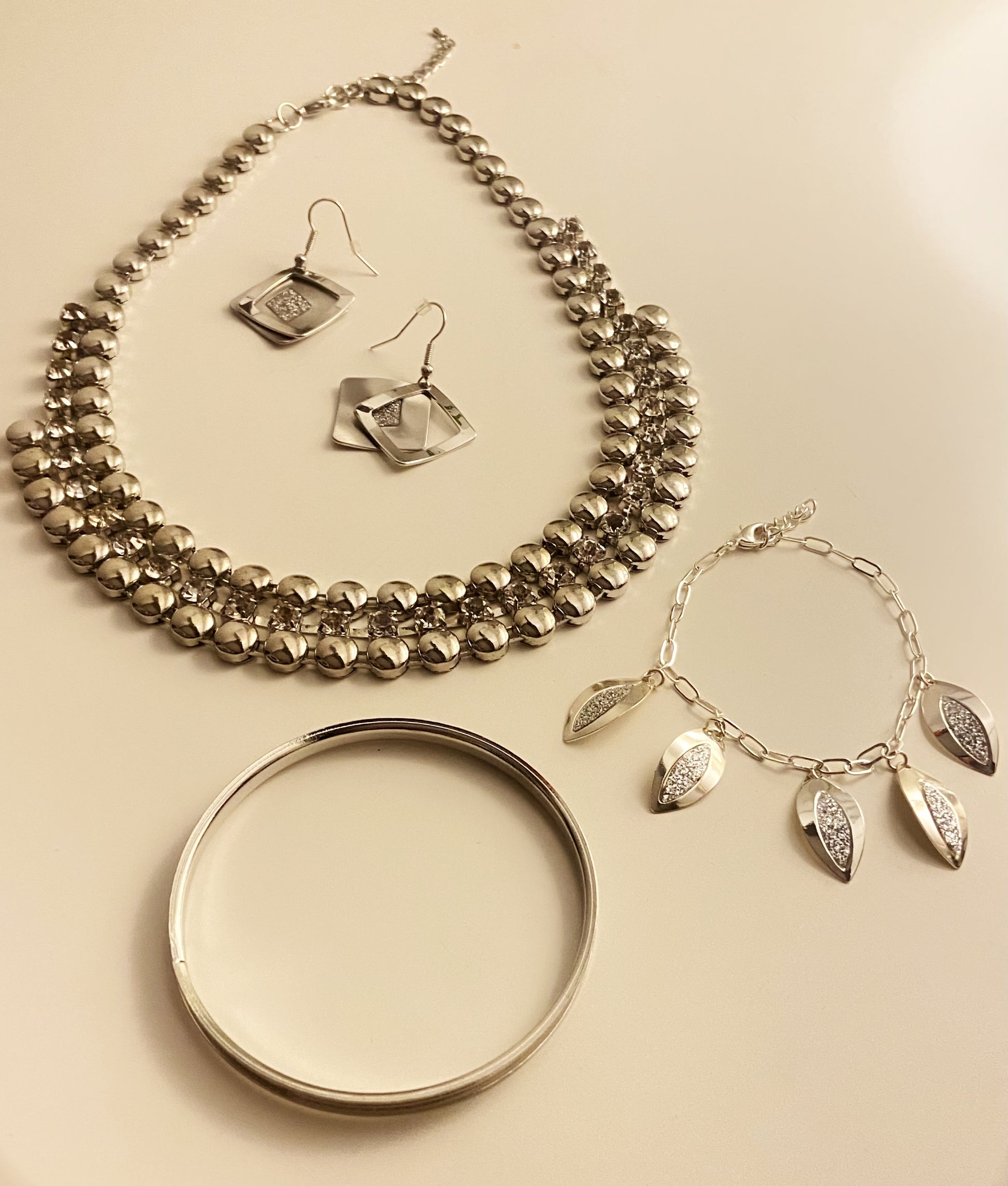 Dieses Set besteht aus der Wild Elegance Halskette,Sqare N Spark Ohrringen,Shiny Leaf Armband und Stardust Bangle Armreif.