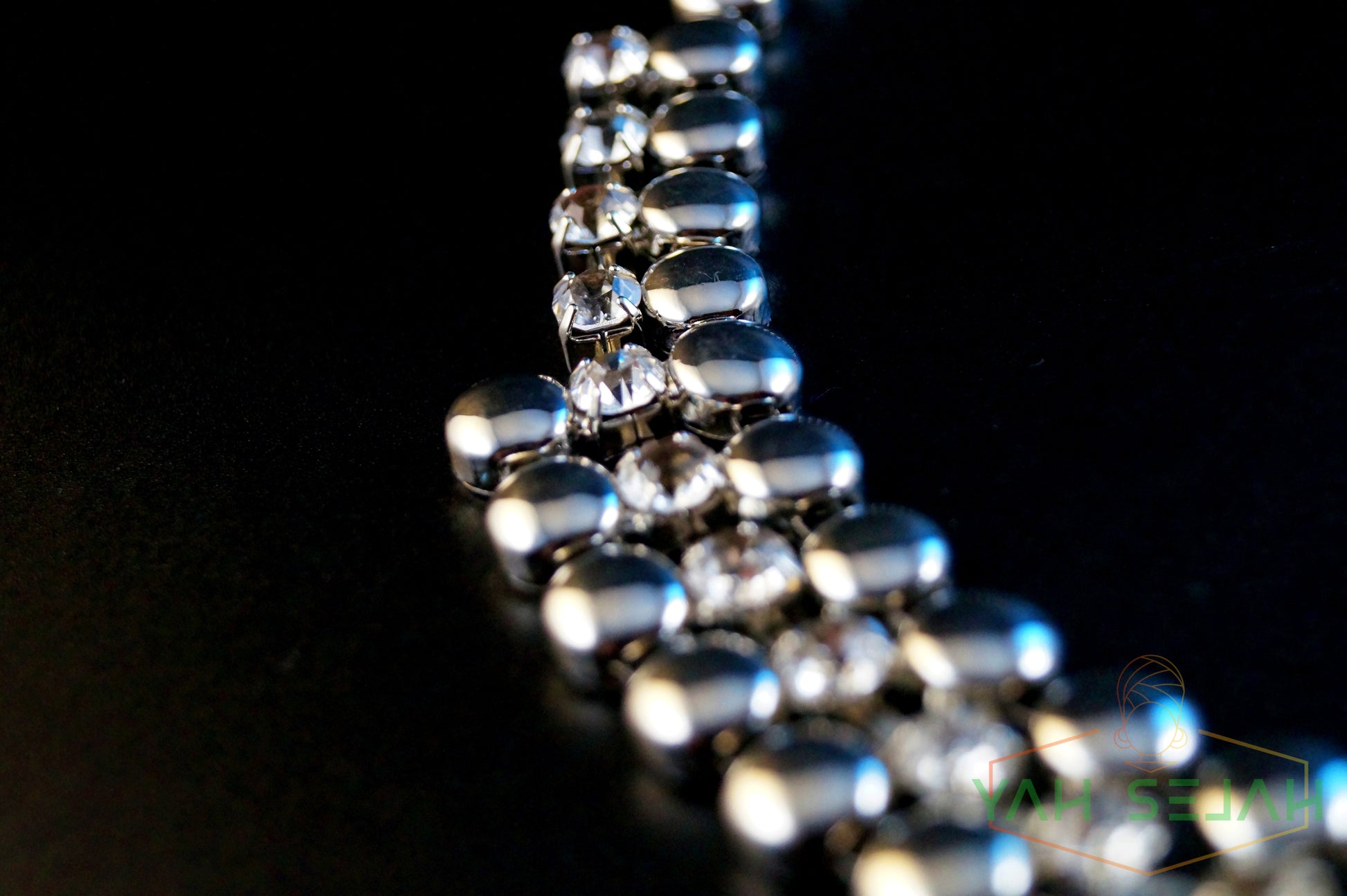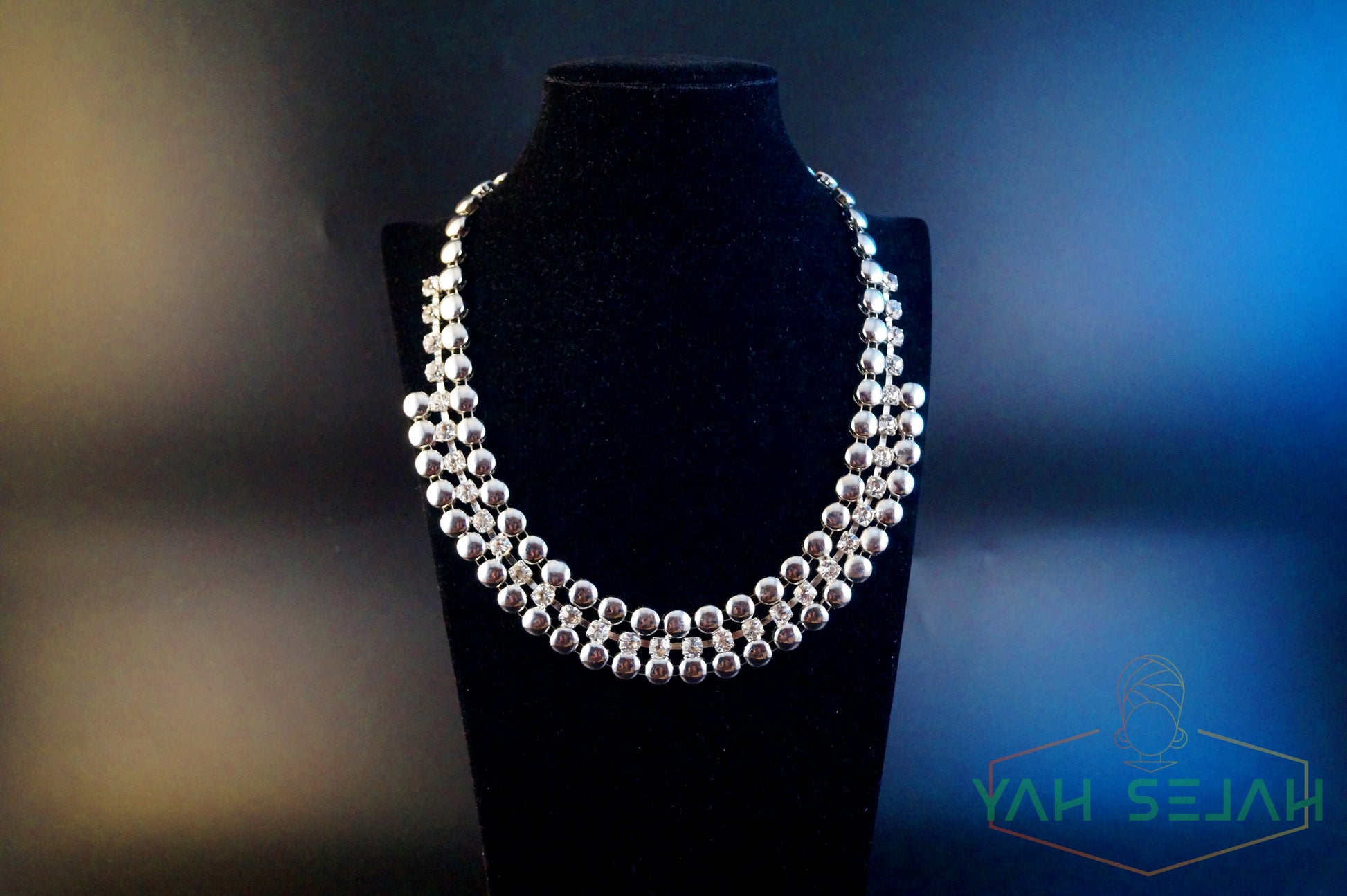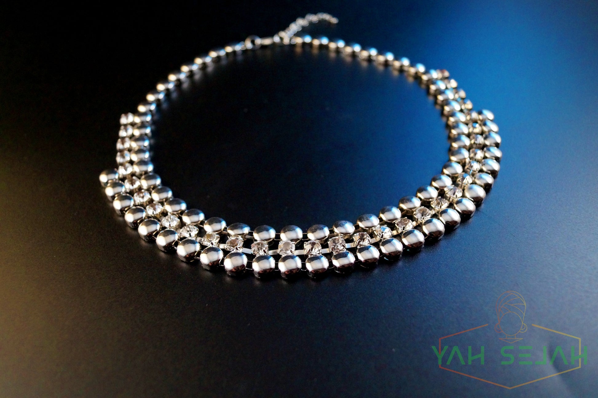 Diese Halskette ist Silberfarben und besteht aus Silberfarbenen runden Perlenähnlichen Elementen die etwas an Nieten errinern.Gleichzeitig besitzt die Kette eine reihe mit quadratischen eingefassten transparenten Strass-Steinen.