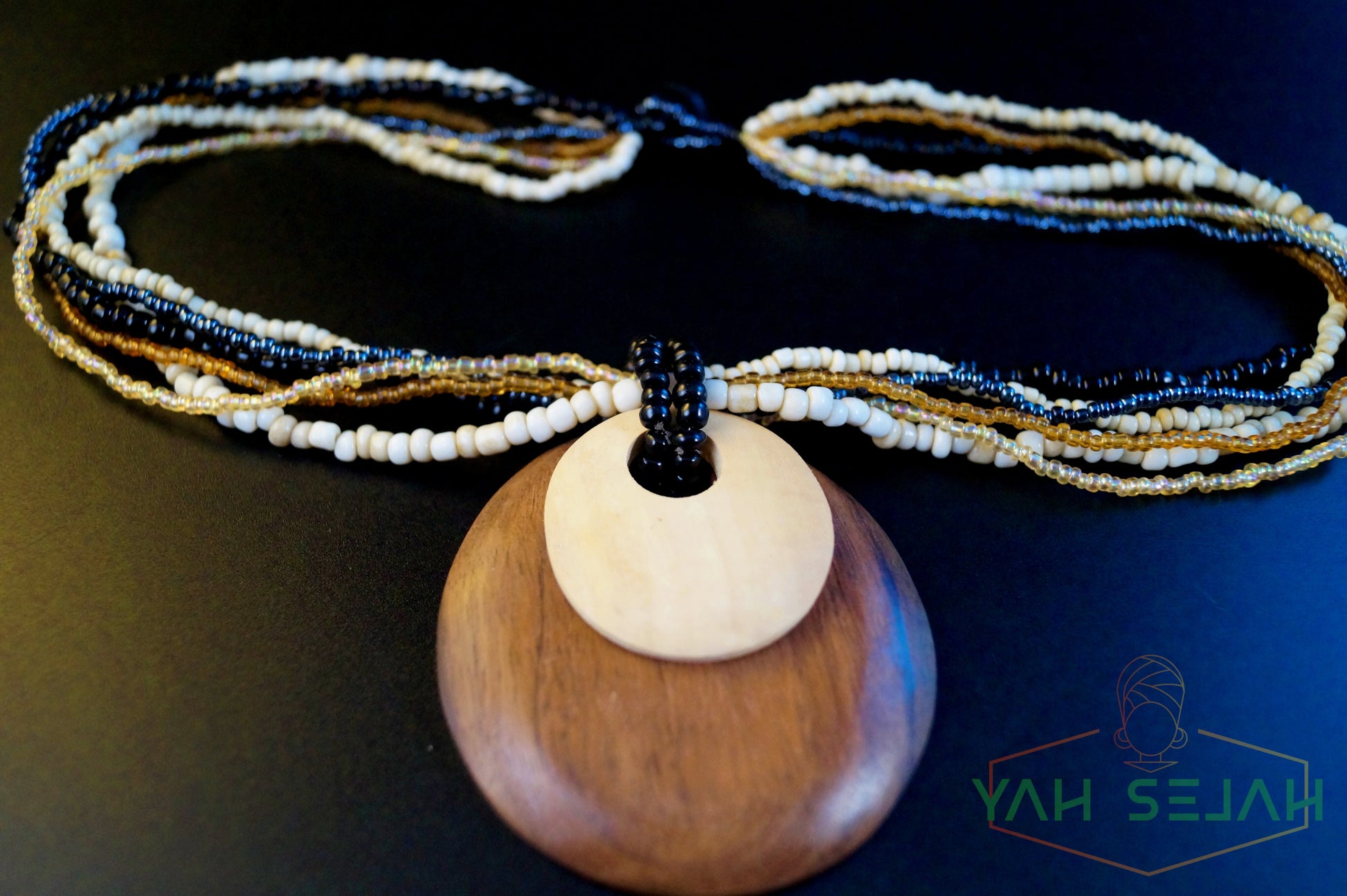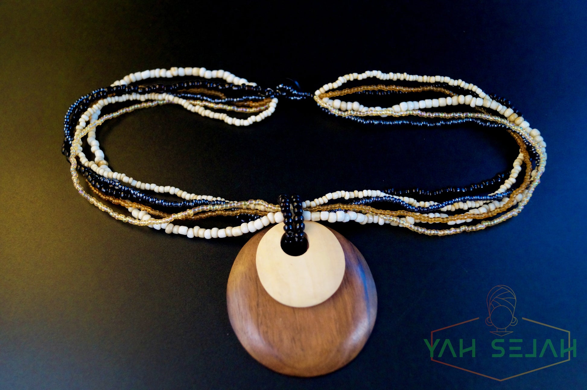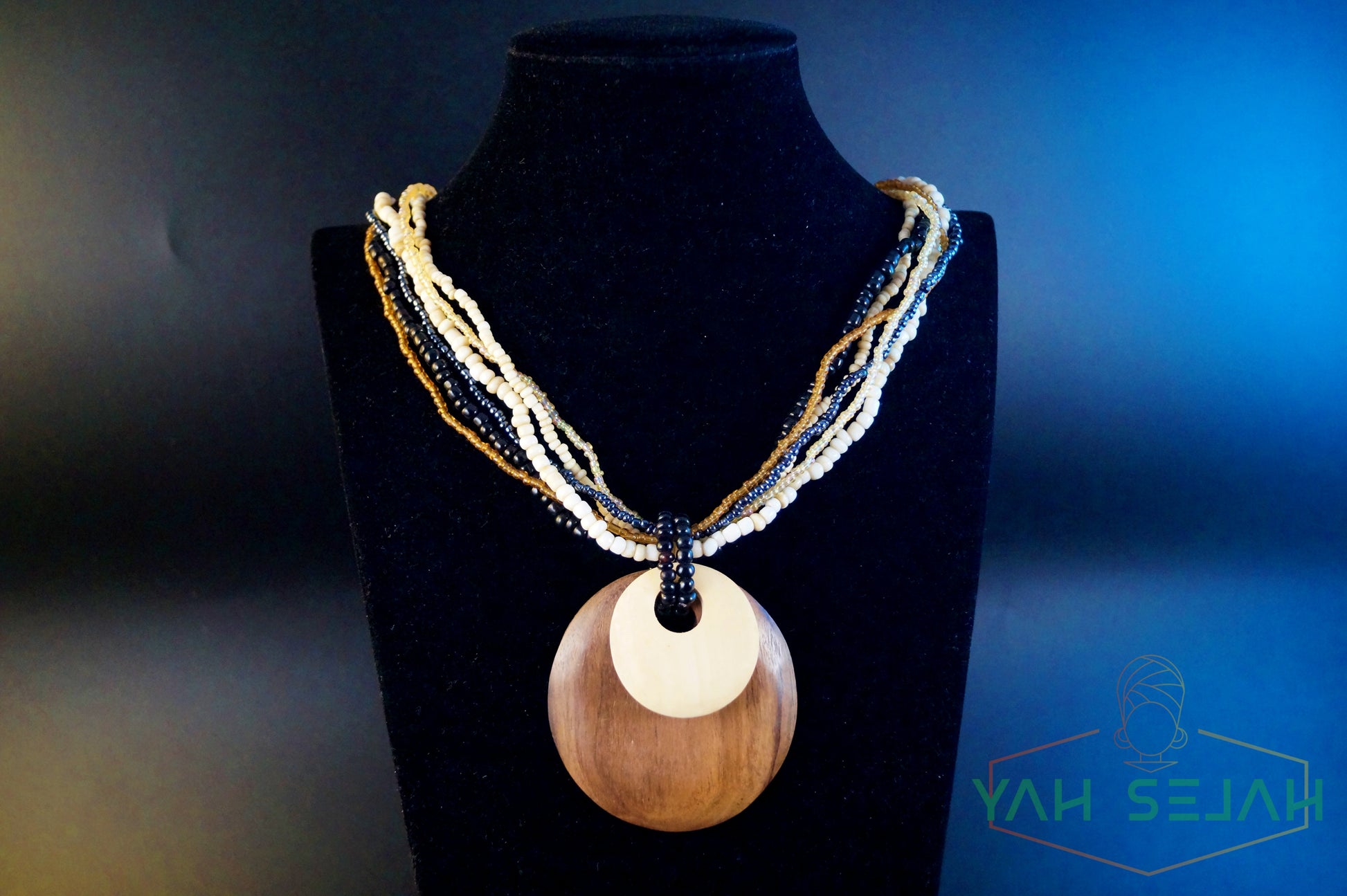Die Kette besteht aus Glasperlen der Anhänger ist aus Holz.